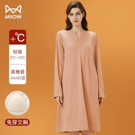 猫人带胸垫睡裙女纯棉长袖春秋季圆领套头宽松休闲大码家居服外穿